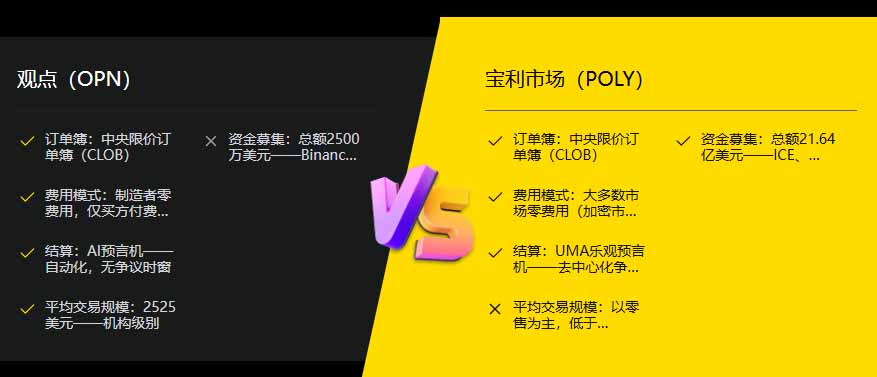 opinion:binance labs、hack vc、jump crypto(总计2500 万美元)。 polymarket:ice、founders fund、vitalik buterin、general catalyst(总计21.64 亿美元)。两者之间存在显著的资金差距。