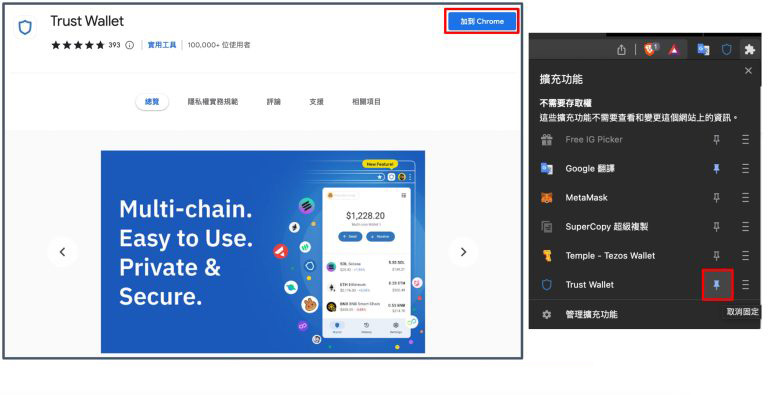 手机版本的trust wallet 钱包在安装后即可使用,而pc 版本浏览器插件在安装后可以在右上角的拼图处找到,你可以点击图钉图案将trust wallet 钱包固定起来。