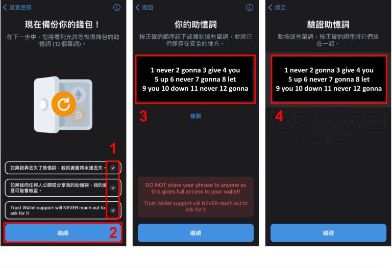 首先了解并勾选trust wallet 钱包的提示,这些很重要必须铭记于心,接下来就会显示你的注记词,请用纸笔或是更安全的方式保存起来,千万不要放在网路上例如云端硬碟之类的增加外泄风险,最后则是验证注记词,按照顺序填写确保你已经把钱包注记词记下来了。