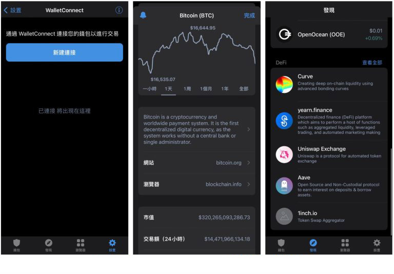- defi 连接:内建web3 浏览器,能够直接连接uniswap、pancakeswap、aave、curve 等去中心化金融(defi)平台,无需额外安装外 挂程式。
