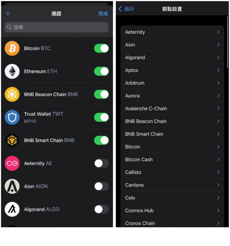 相较于metamask 小狐狸钱包新增币种需要自己去找出加密货币合约地址新增,trust wallet 钱包在新增币种与网路管理就相当贴心!