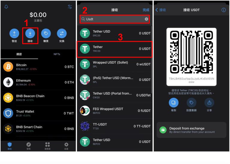 - 区块链转帐:用trust wallet 显示的qr code 或收款地址转给付款人,付款人即可将资金转入你的钱包。