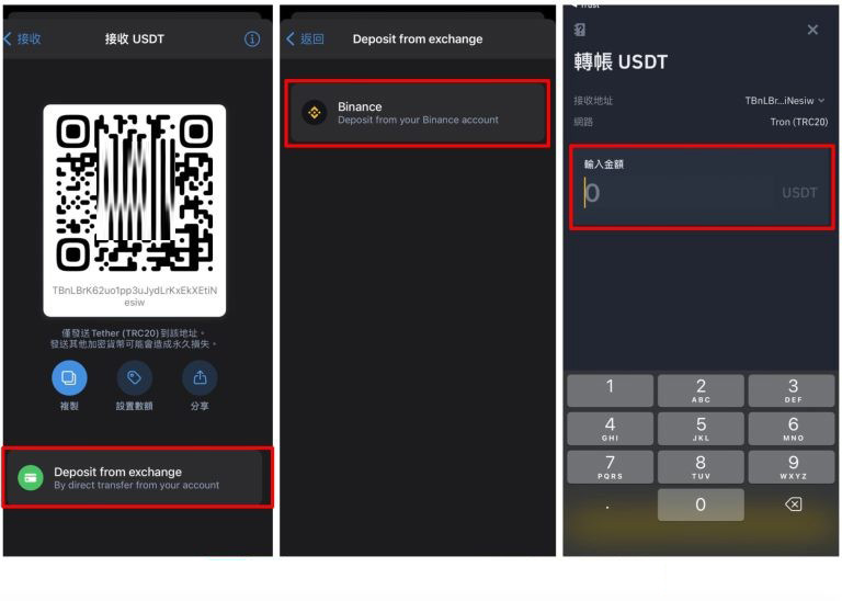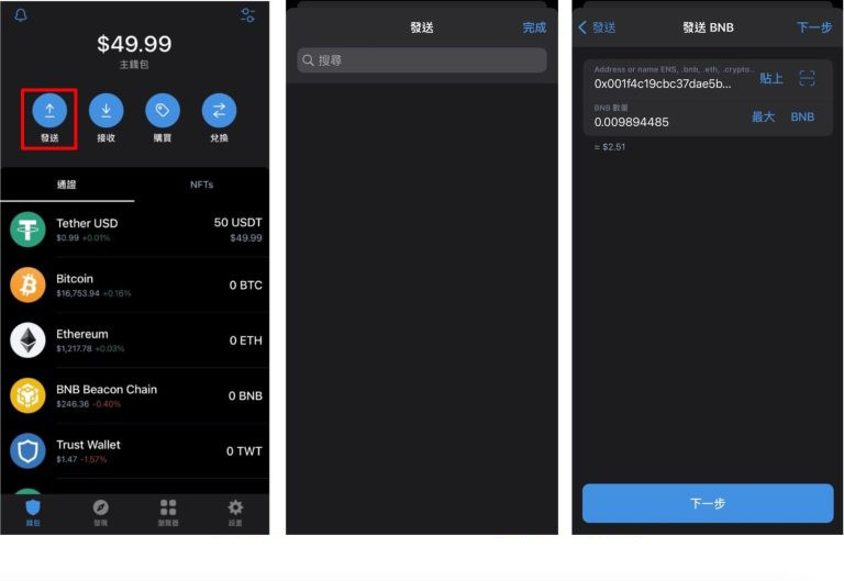 在币安交易所取得入金地址后,于trust wallet 点击发送,并选择转出usdt。