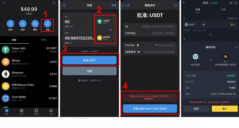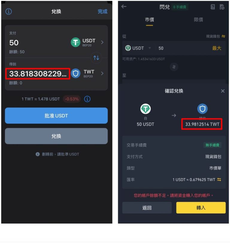 下面以50 usdt 所能购买到的busd 与twt(trust wallet 平台币)做个表格来简单对比trust wallet 与币安交易所: