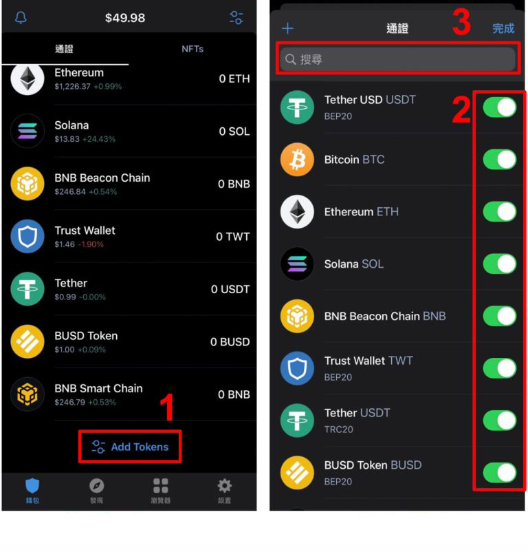 - 点击搜寻查找你所想新增或移除的代币。