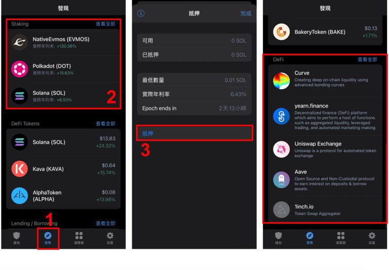 - 质押:用户可透过trust wallet 将持有的加密货币质押,赚取staking 奖励,如bnb、sol、atom 等。