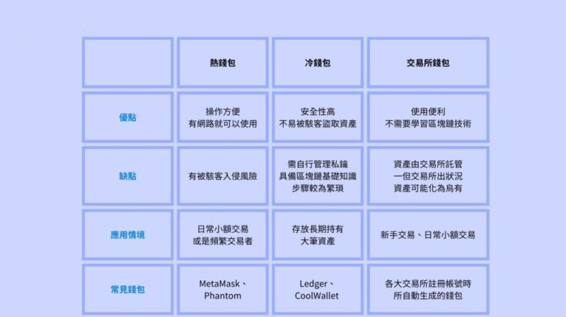- 缺点:需自行管理私钥、具备区块链基础知识,使用时需搭配硬体装置,步骤较为繁琐。