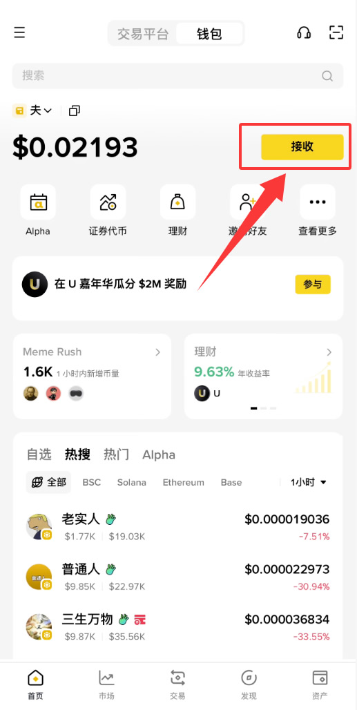 在币安web3 钱包首页点选【接收】