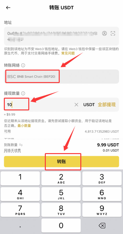 6、输入转账【数量】,确认网络手续费(通常为0.01 usdt),点击【转账】并确认操作