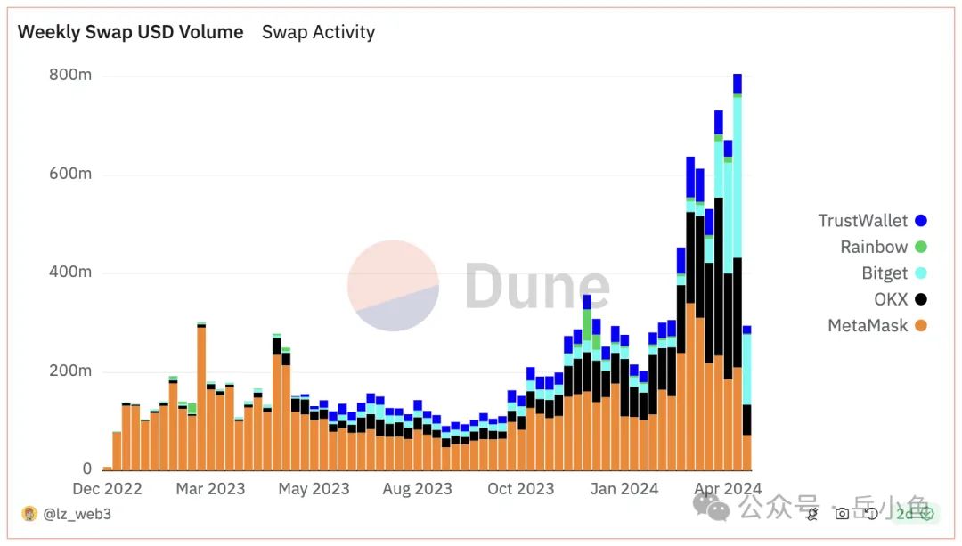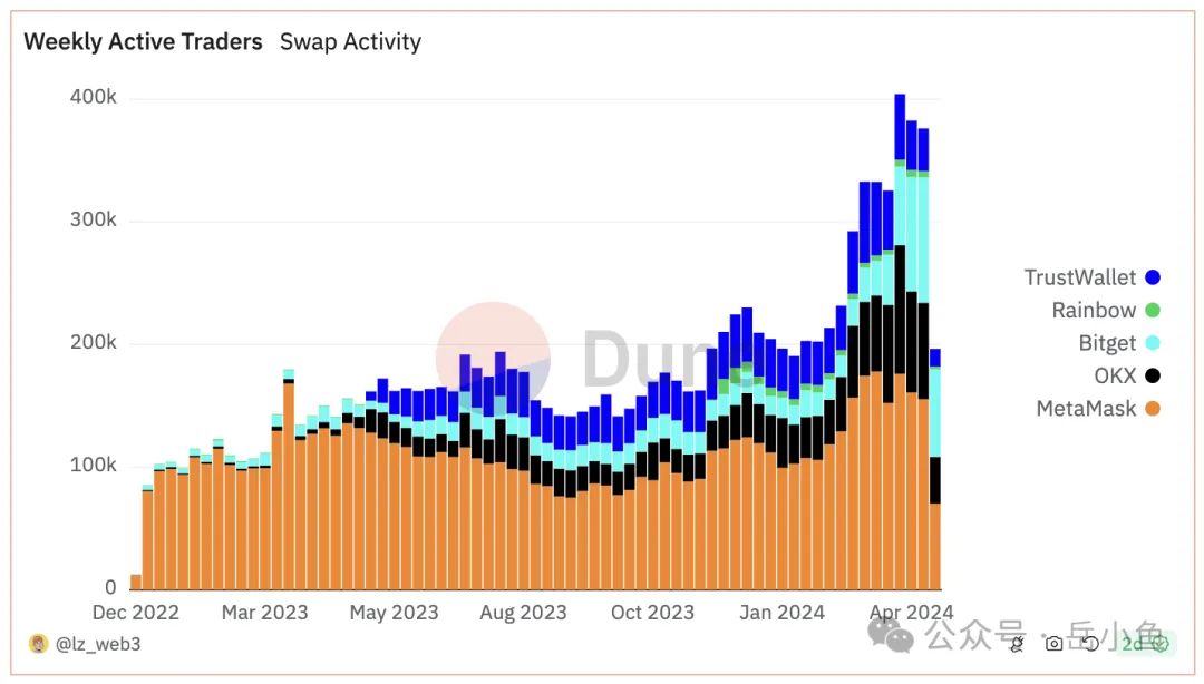 (3)数据情况:从2023年5月开始,okx web3 wallet借助铭文热潮开始迅猛增长,弯道超车bitget wallet,引发了web3钱包大战;到了2024年4月,bitget wallet宣布发币,通过空投计划吸血其他钱包,再次实现弯道超车okx web3 wallet,web3钱包大战再次升级;