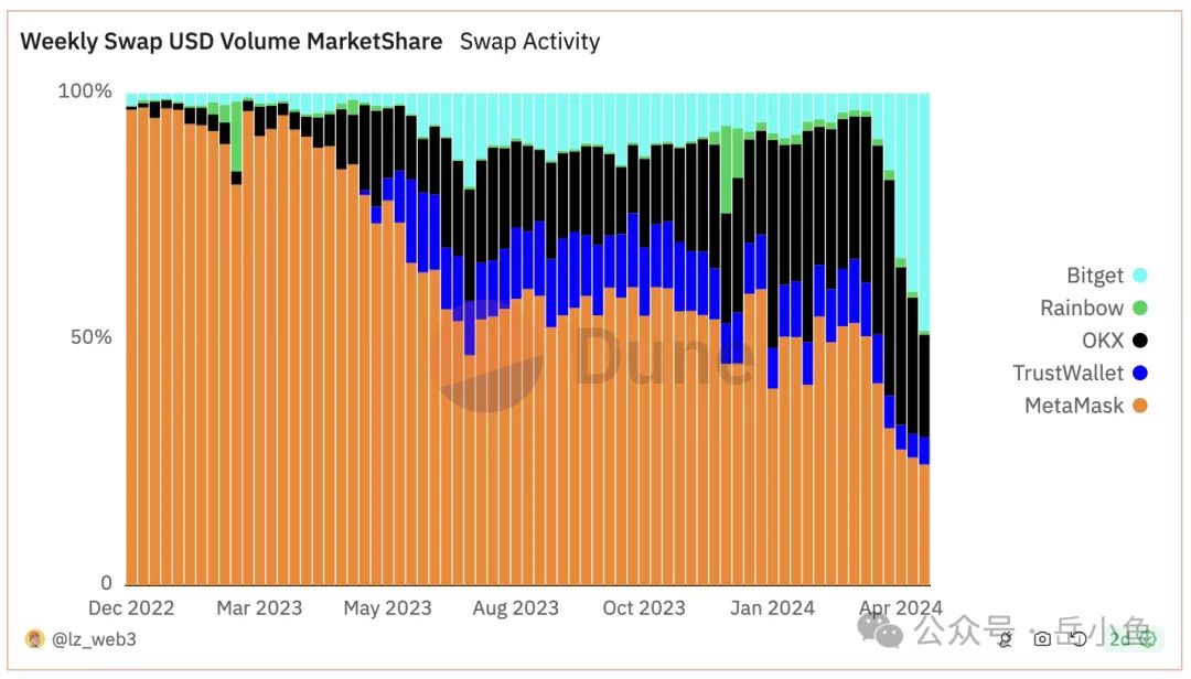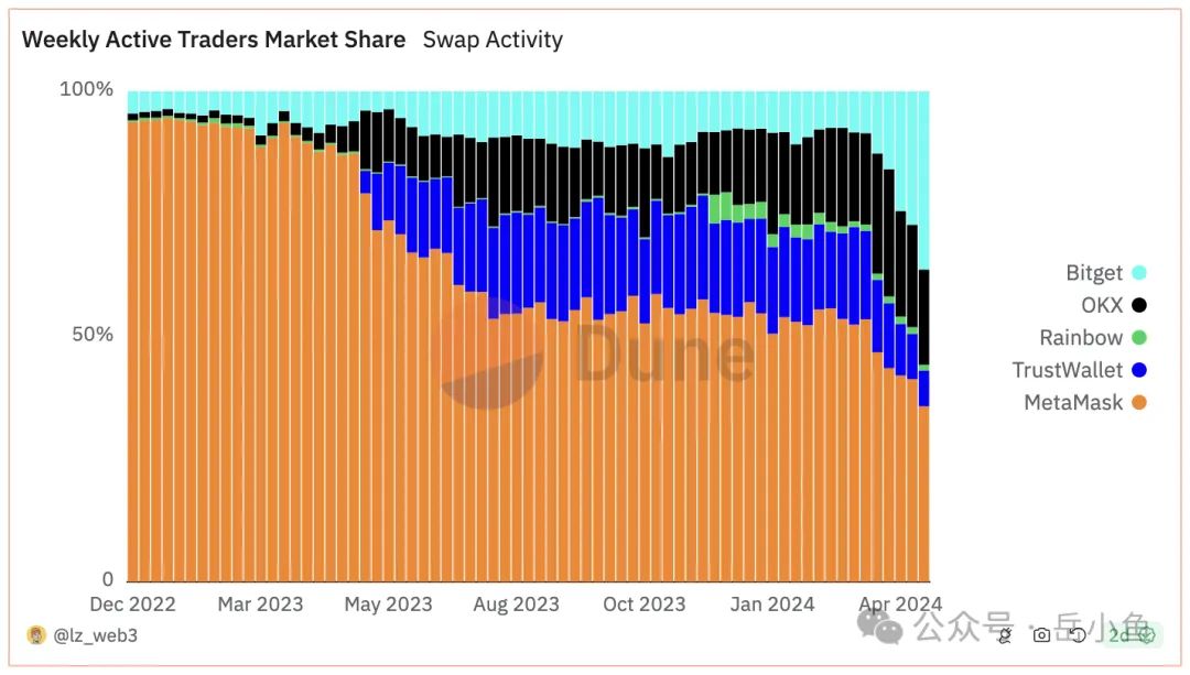 在2023年5月份之前,metamask占据市场的绝对份额,其次是bitget钱包也占据了一定的市场份额;但是从2023年5月开始,okx、bitget、trust wallet等交易所钱包的增长非常明显,metamask的市场份额被挤压。
