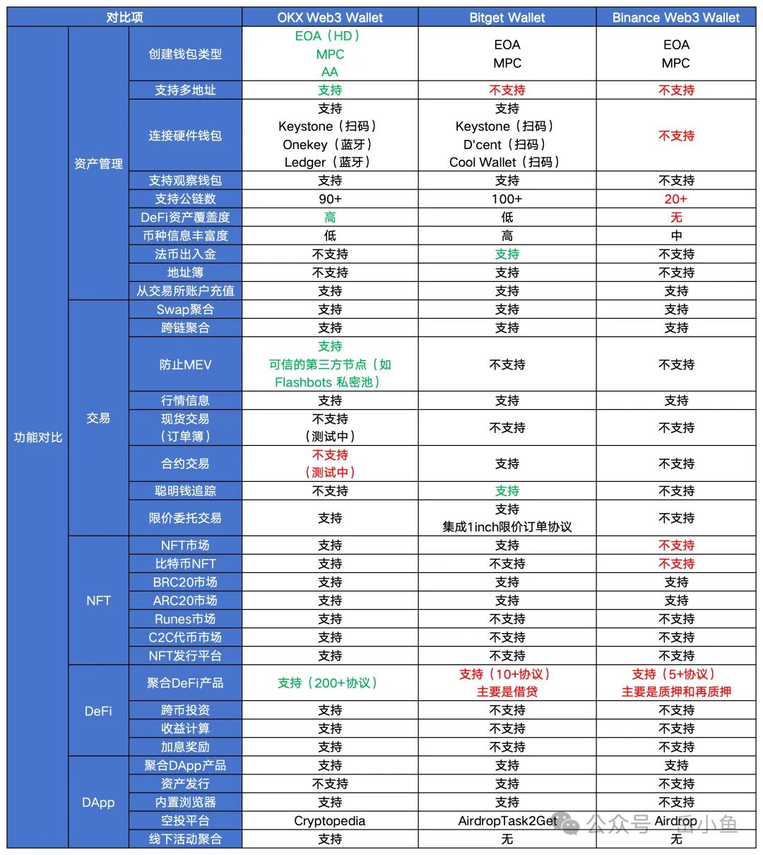(4)钱包类型:eoa钱包是最基础的类型,目前比较热门的是mpc钱包,未来的探索方向是aa钱包,整体上okx钱包做得更靠前;