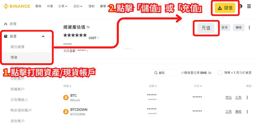 如果你用的是币安的网页版,先打开你的资产总览或现货账户都可以,然后直接点击账户里面的「储值」或「充值」按钮。