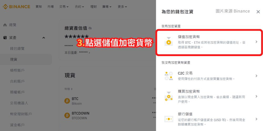 再来,这边因为我们要寻找加密货币的钱包地址,所以选择「储值加密货币」即可。
