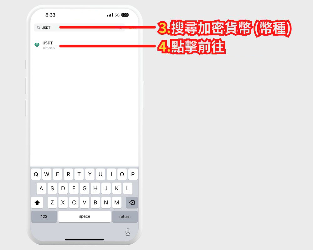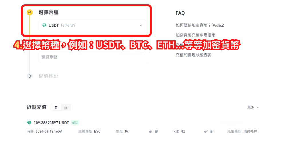 再来一样要先选择「币种」,你可以在上方的搜寻框搜寻你想充值的加密货币 (例如:btc、eth、bnb、usdc),然后点选它。