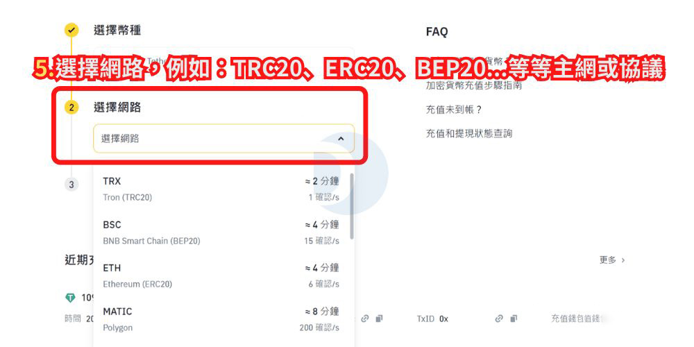 但要特别注意,你要选择另一个钱包也有支援的主网 (网络),两边都要选相同的主网,选错主网会导致充值失败,最严重就是会丢失加密货币资产。