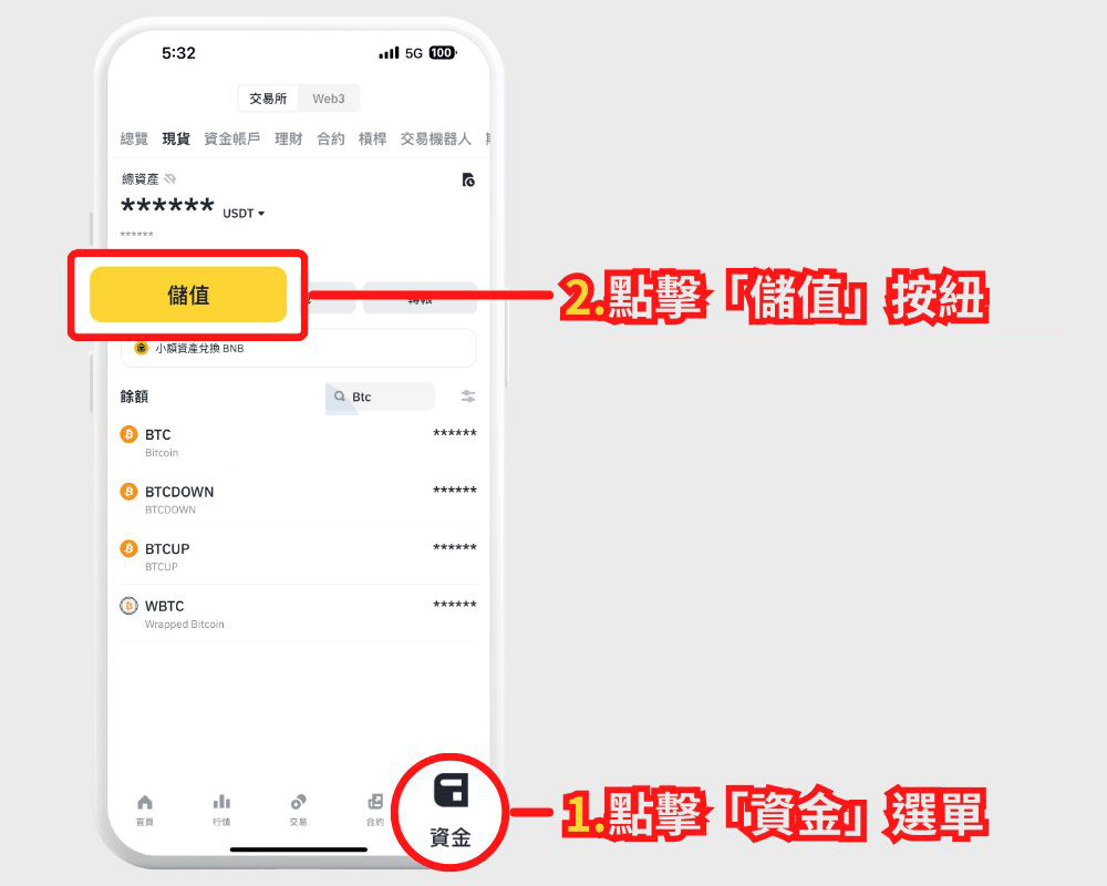 如果你用的是幣安的 app 手机版,先将 app 转为 pro 专业版本,然后点选右下角的「资金」选单打开资产总览,接着再点击画面中的「储值」按钮进入下一步。
