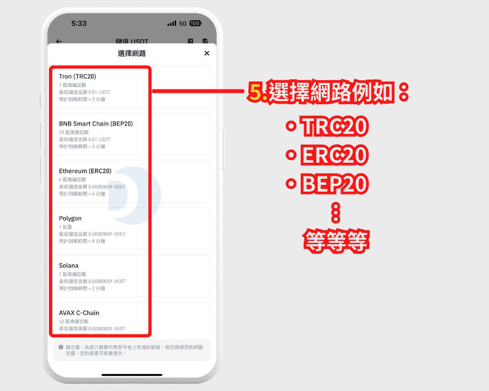 注意,选择不同的网络会造成充值失败,并且会丢失资产。