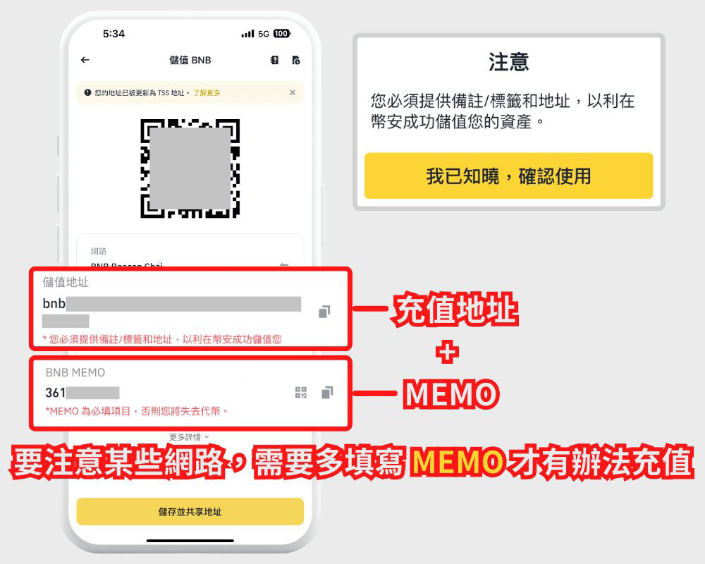 另外,有些幣種在透過某些網路充值的时候,會有出現「memo」這項資料,這时候就要連同「充值地址」一起填寫到提幣端錢包的提幣資訊欄位上,這樣幣安才能識別這筆充值的資產是不是你的。