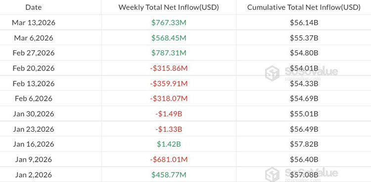 自 1 月 2 日起,美国现货比特币 etf 的每周流动。来源:sosovalue