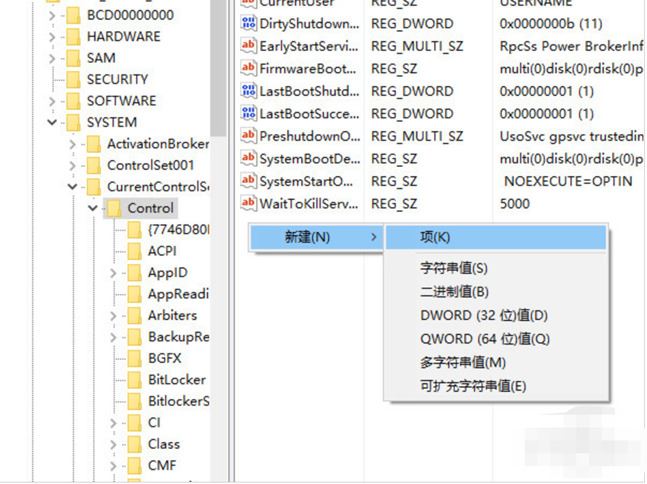 3、新建方法。右键点击“control”(或者直接在右侧空白区域点击右键),然后依次点击新建-项(如图)