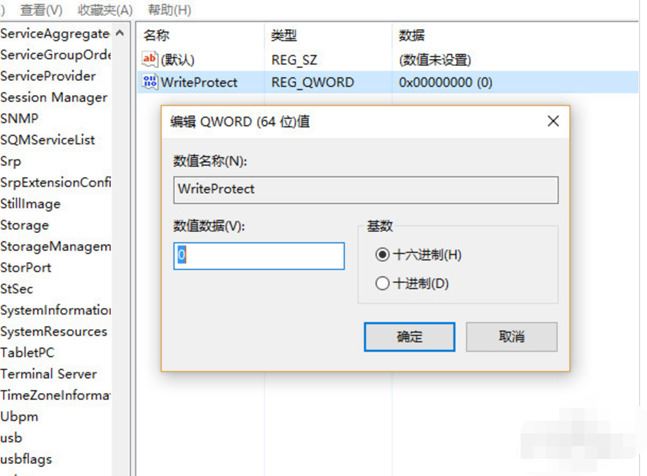 6、然后在点击writeprotect。 把writeprotect的数值数据设置为0,然后点击确定之后插入u盘即可。