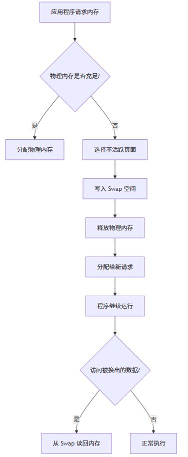 上图展示了 swap 在内存压力下的基本工作流程。内核通过页面置换算法(如 lru)选择哪些页面应该被换出,以最小化对系统性能的影响。