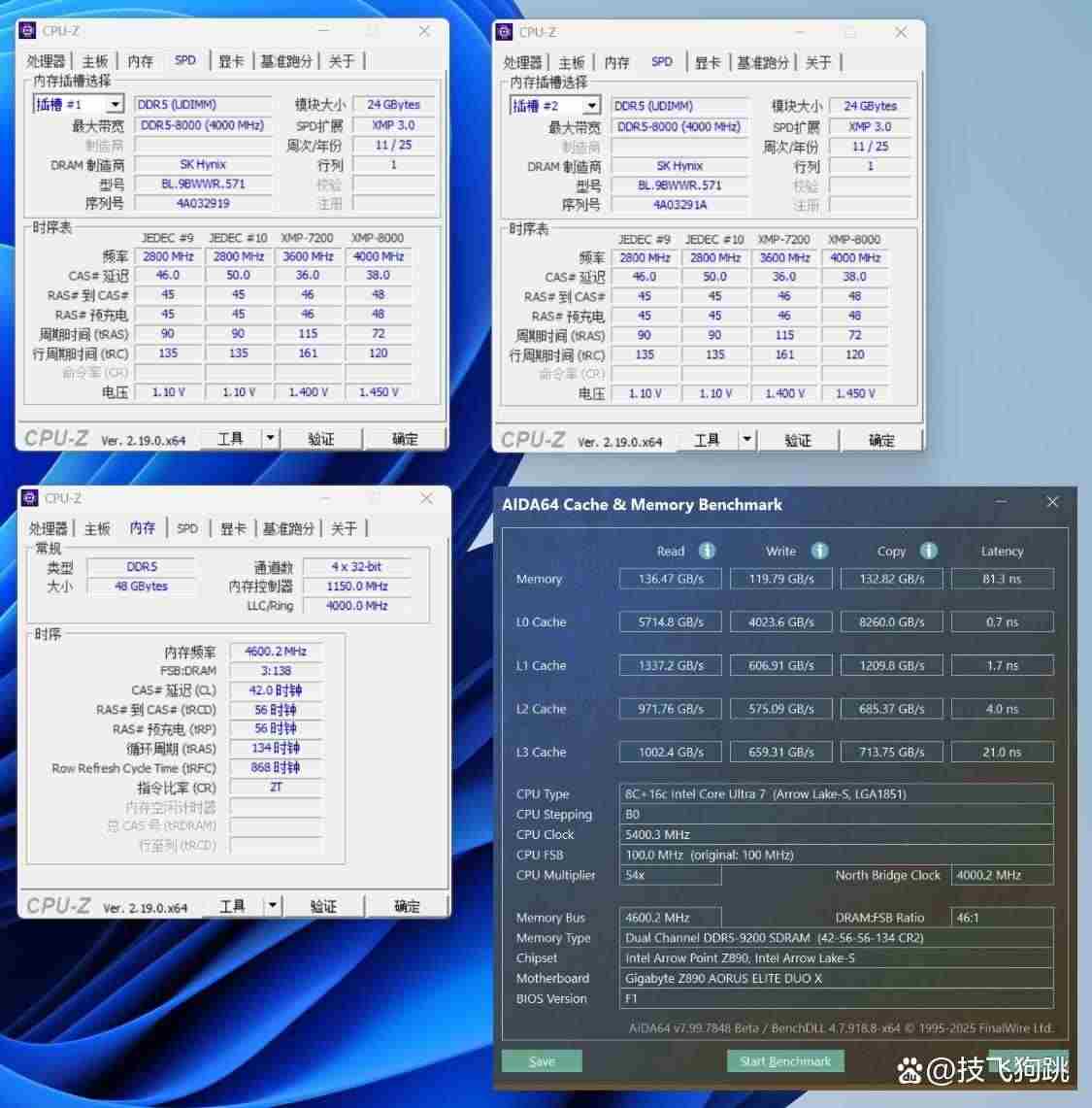 继续向上尝试,选择:hynix.xmp.9200 24g档位,读取速度为136.47 gb/s,写入速度为119.79 gb/s,复制速度为132.82 gb/s,延时为81.3 ns: