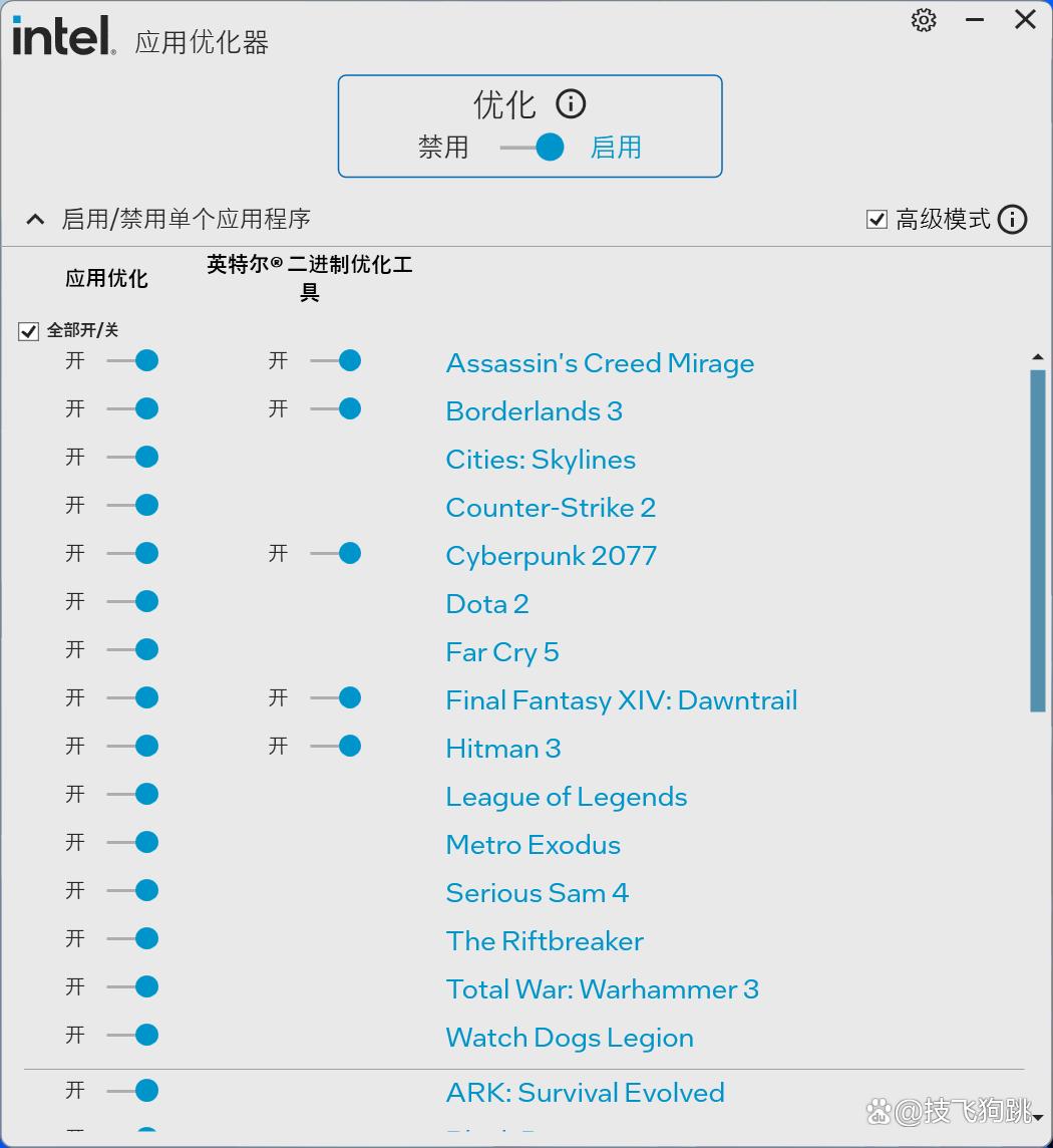 游戏测试前,记得打开 apo,勾选高级模式,二进制优化也开启。