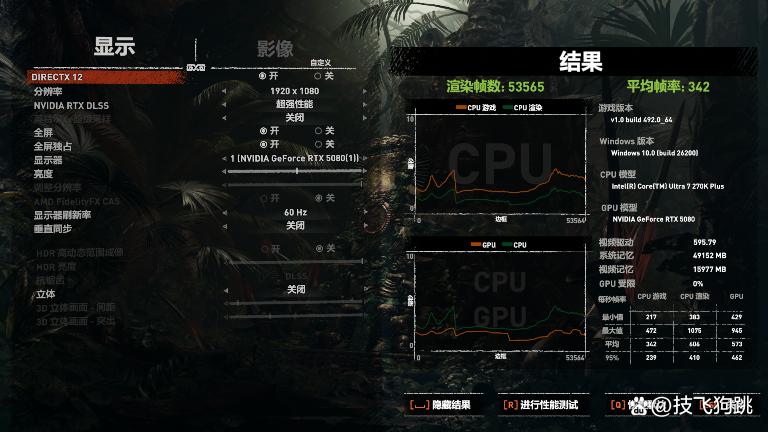 《古墓丽影·暗影》基准测试,使用u7-265k与开启apo游戏优化功能后的u7-270k plus处理器,游戏在不同分辨率、dlss档位、超分模型的设置下,游戏帧数表现如下: