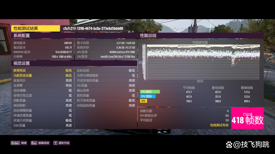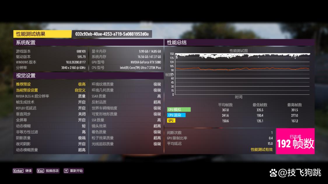 《极限竞速·地平线5》游戏基准测试,极端画质,极端光追,4k分辨率,dlss质量模式下,游戏平均帧数为192 fps,dlss超高性能模式下,游戏平均帧数为222fps。1080p分辨率,极低画质,关闭光追和dlss,游戏平均帧数为418fps。