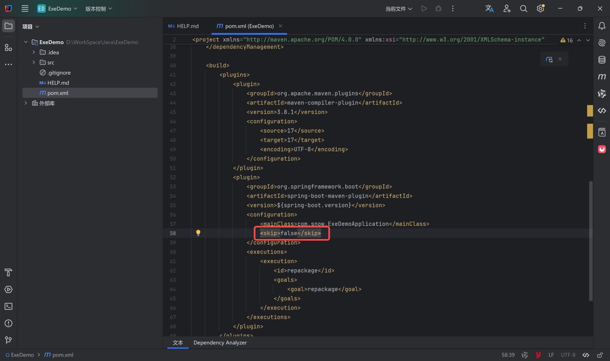 <skip>true</skip> 设置阻止了可执行 jar 的创建,需要修改这个配置