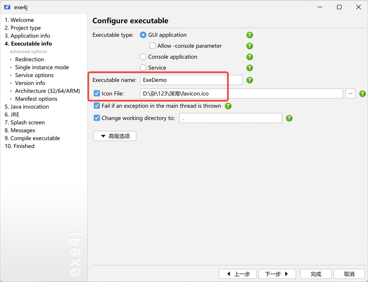 在输入框中填写生成的 .exe 文件名,不需要带 .exe 后缀,exe4j 会自动添加。