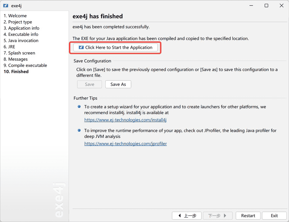 保存配置:点击 “save as”,将当前的 exe4j 配置保存为文件(例如你的项目名.exe4j),方便后续修改或重新打包时复用配置。