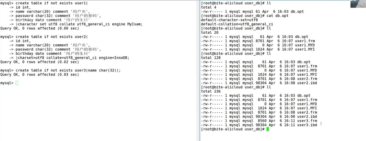 create table table_name ( field1 datatype, field2 datatype, field3 datatype ) character set 字符集 collate 校验规则 engine 存储引擎; 说明: field 表示列名 datatype 表示列的类型 character set 字符集,如果没有指定字符集,则以所在数据库的字符集为准 collate 校验规则,如果没有指定校验规则,则以所在数据库的校验规则为准 也可以不带后面这些,由系统默认给与