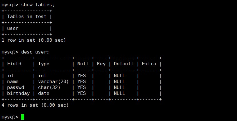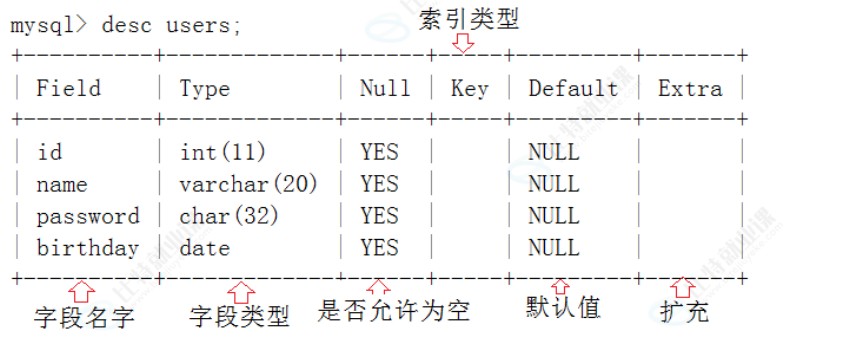 查看该表的详细结构 : desc [表名称];