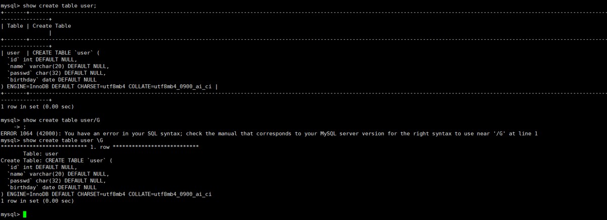 查看创建该表时候的操作 : show create table [表名称] (; 或者 \g)