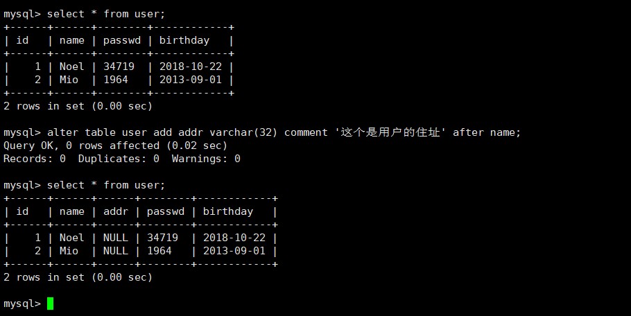 alter table [表名称] add [新增的名字] [类型] (comment '可以写一下这段是干什么用的') (after [其他表内容的名字])(可以插入指定列的后面);