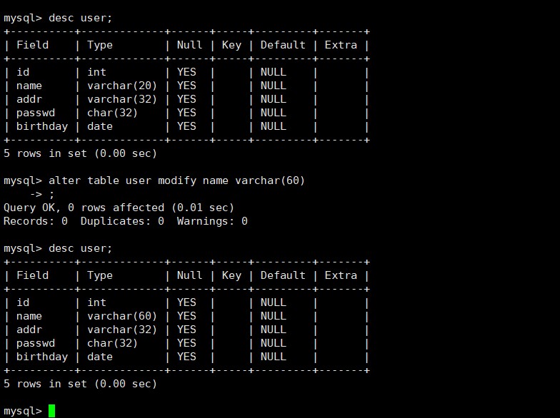 alter table [表名称] modify [修改的那一列名字] [修改后的内容]