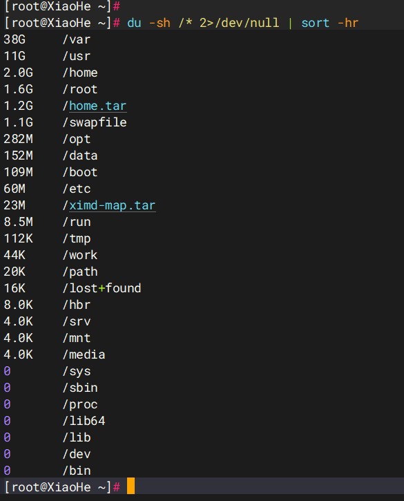 可以敲下面的命令,看根目录下的目录占用磁盘空间的情况