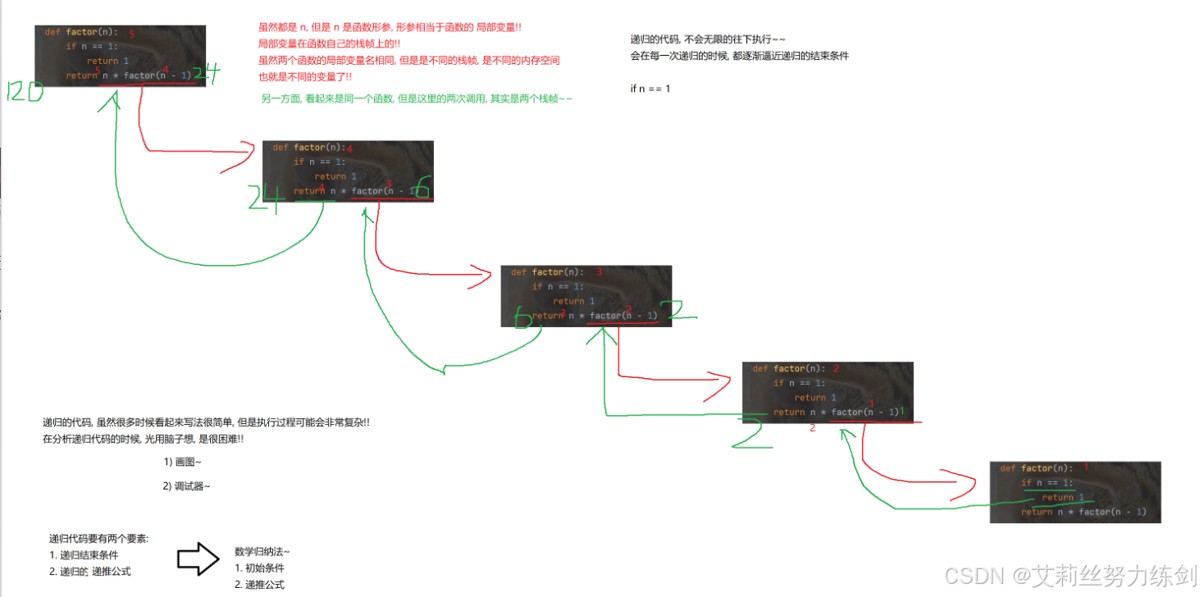 (2)每次递归的时候,要保证函数的实参是逐渐逼近结束条件的。