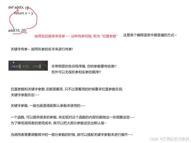 在调用函数的时候,需要给函数指定实参,一般默认情况下是按照形参的顺序,来依次传递实参的,但是我们也可以通过 关键字参数,来调整这里的传参顺序,显式指定当前实参传递给哪个形参。