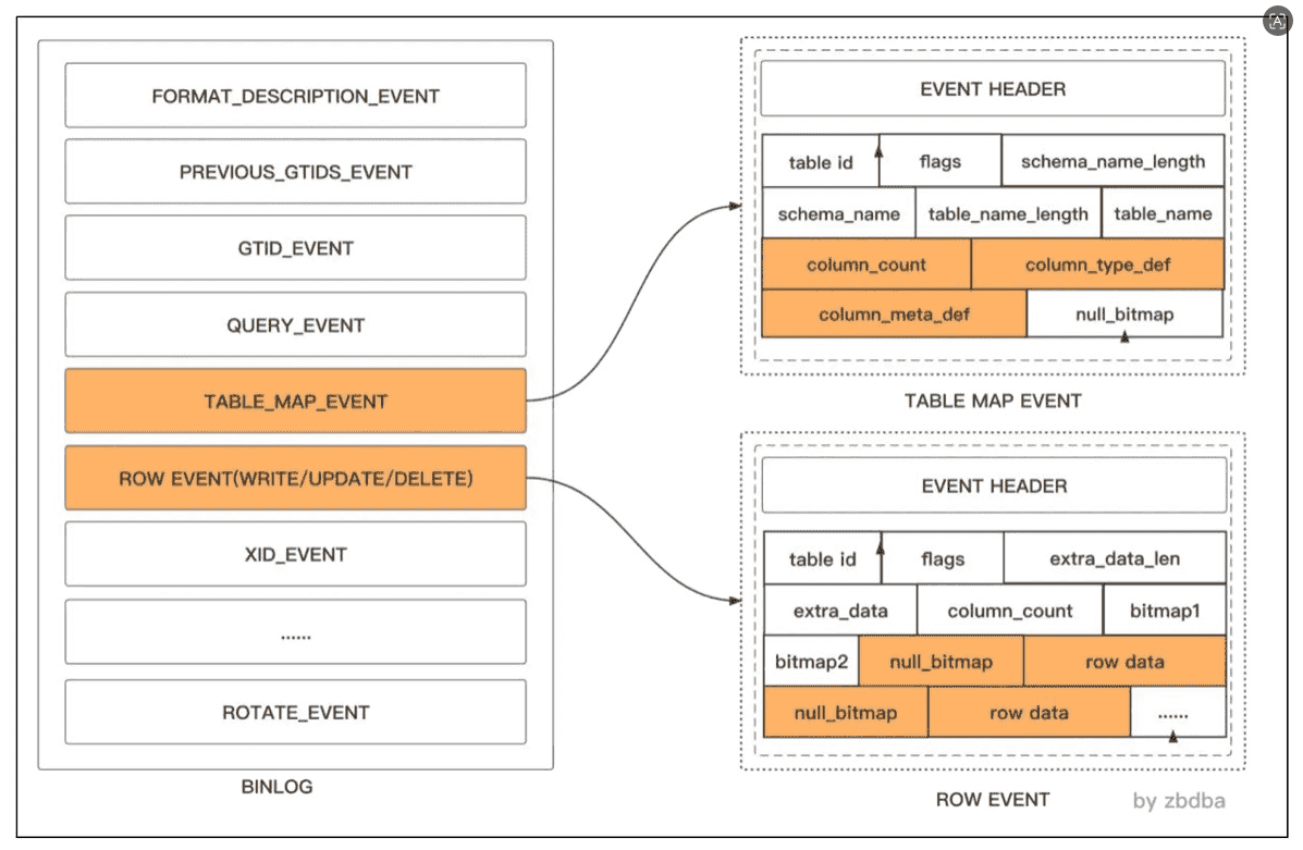 table_map_event | 19 | 行级日志(row格式)的前置事件,描述表结构、表id、列信息等映射关系 |