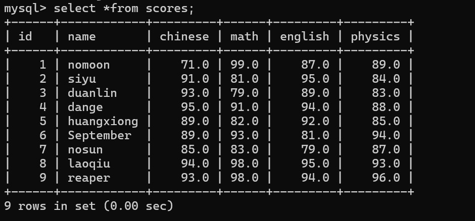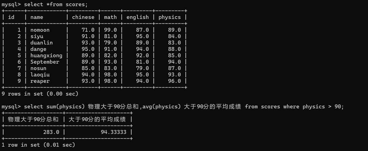 关于scores表查询物理成绩大于90分的总和以及大于90分的平均成绩