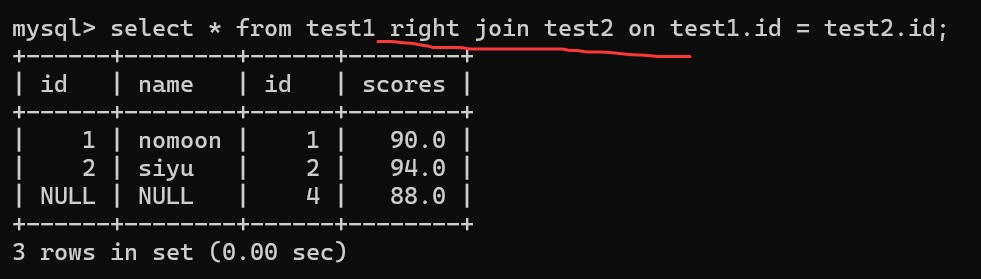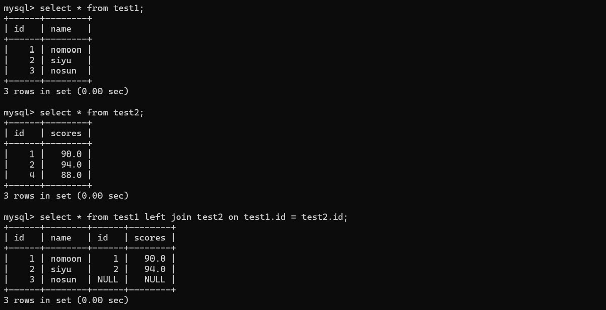 select * from 表1 left join 表2 on(限制条件); left join 以左表为基础,即表1 select * from 表1 right join 表2 on(限制条件); right join 以右表为基础,即表2 select * from 表1 left join 表2 = select * from 表2 right join 表1