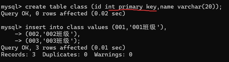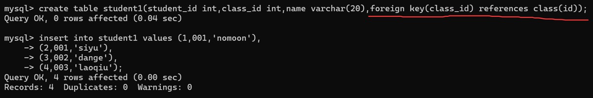 创建子表并插入数据,外键为class_id,当插入数据是父表中具有的则能正常插入