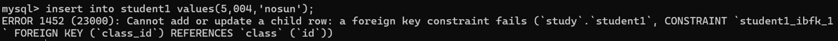 此时当班级id为004时,插入数据是父表中不具有的时候则会报错