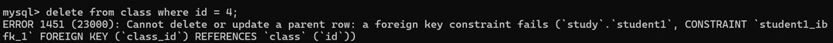 同样的操作如果是删除父表中的某个数据,若该数据正好有主键与外键的约束且子表正好用到了,父表则会提示删除失败,要想删除父表中已被约束的数据需要先将子表中的数据删掉