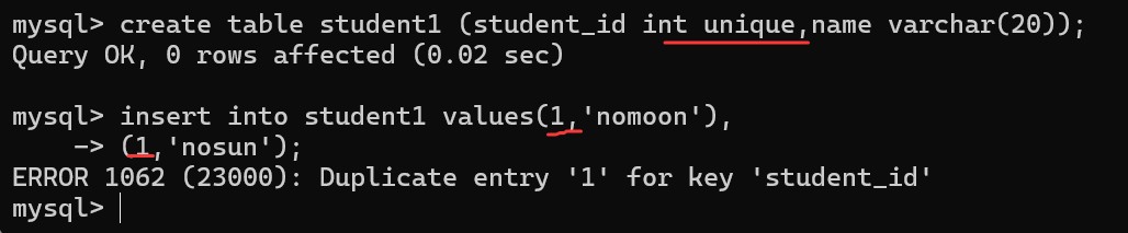 create table 表名(列名 数据类型 unique,列名 数据类型...);