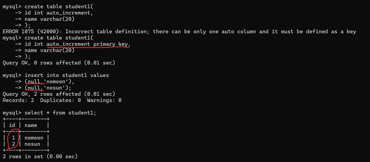 补充:还可以通过添加auto_increment来为特定列进行自动填充数据